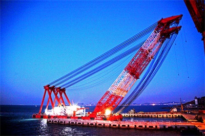 大型浮式起重機也稱為起重船或浮吊,可采用雙臂架結構,起重量可達3600噸,起升高度可達110米,廣泛應用于沿海及近海的大型橋梁和設備的吊運、安裝及打撈作業等。該類起重機起重量大、起升高度高,操作方便、靈活、準確,維修方便,能滿足施工海域風大、浪高、水深、流急等惡劣海況的要求,技術達到國內領先水平。