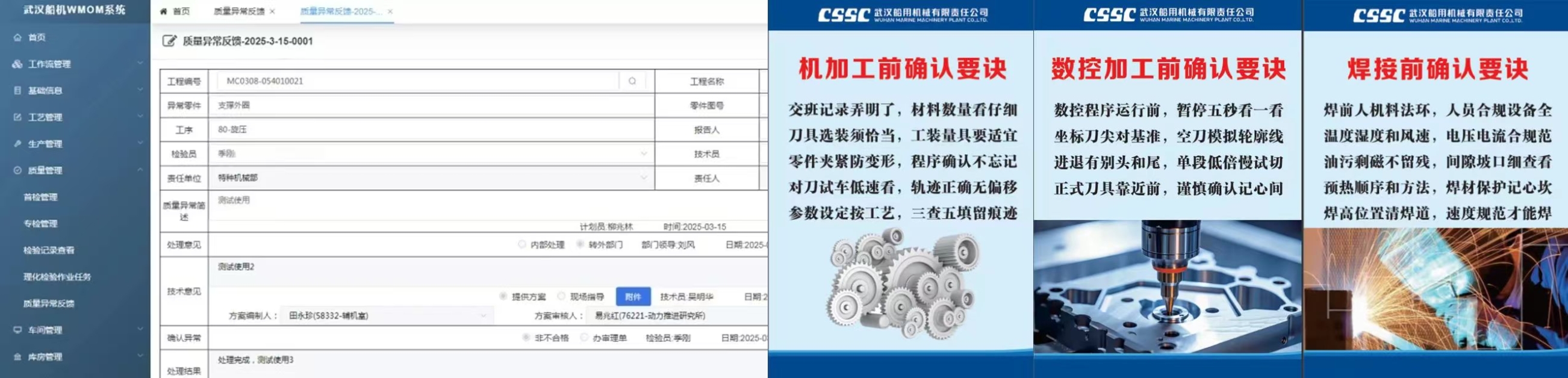 為進一步提升生產(chǎn)管控水平,中船集團武漢船機總結質(zhì)量管理好的經(jīng)驗做法,以操作者為中心,探索新的管控手段,利用信息管理系統(tǒng)賦能,基于WMOM系統(tǒng)推出“確認制、舉手制、推送制”功能。