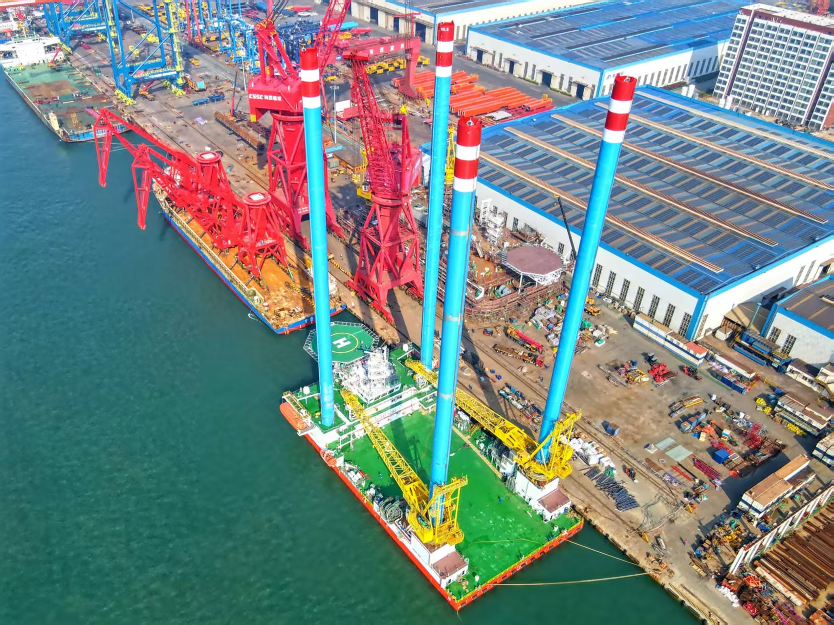 一聲歸航的汽笛響起,JANA 508平臺緩緩停靠在中船集團武漢船機旗下海西重機碼頭,標志著近兩個月來由中船集團武漢船機總包建造的三座自升式海上作業支持平臺密集的試航任務圓滿結束。從空中鳥瞰,三座自升式海上作業支持平臺猶如三個鋼鐵巨人屹立在碼頭邊。