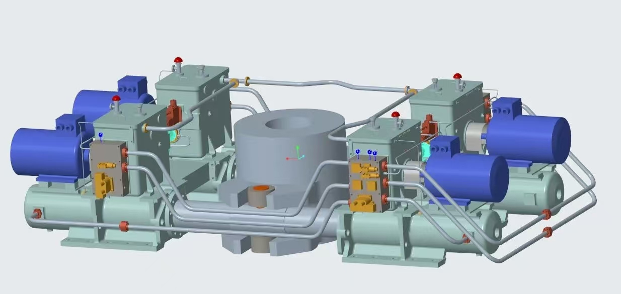 17000TEU雙燃料集裝箱船是綠色新能源船舶的典型代表,武漢船機為該船提供的舵機型號為FE42-1150-T050,最大工作扭矩可達11280kN·m,最大轉舵角度為37度,單臺舵機配備的四套動力系統為雙柱塞四油缸拔叉式舵機結構,具有系統性集成度高、可靠性高、性能優等特點。